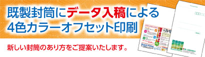 一般には封筒のカラー印刷は製袋前の紙に印刷しますが、弊社では既製封筒に単色から4色カラーのオフセット印刷が可能です。(角0まで)
