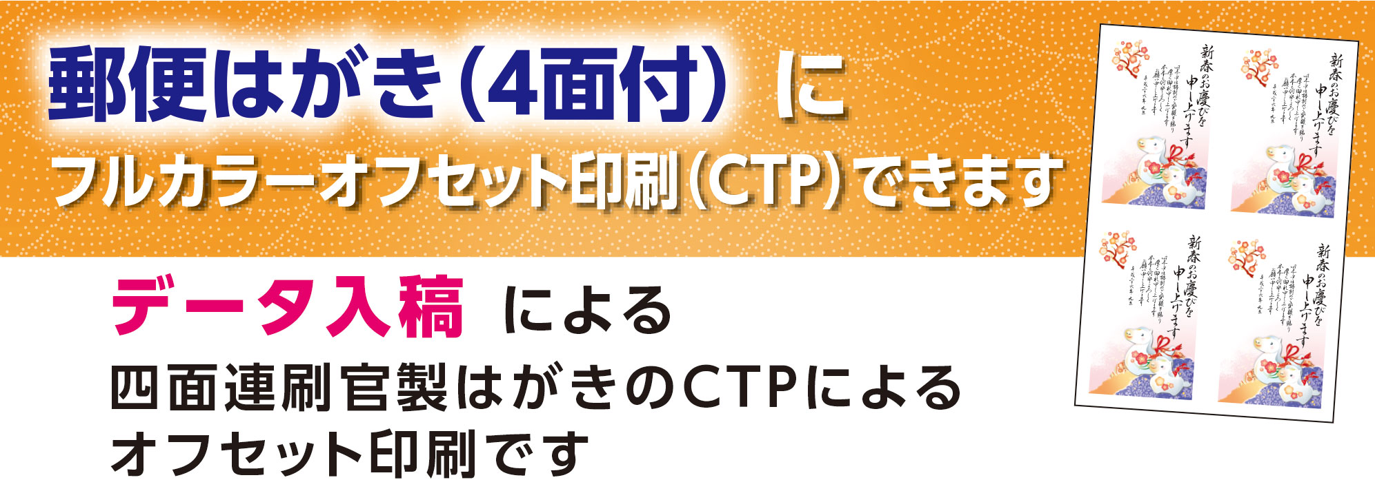 四面連刷(200ミリ×296ミリ)の郵便はがきに、CTPにより4色オフセット印刷機で印刷いたします。
