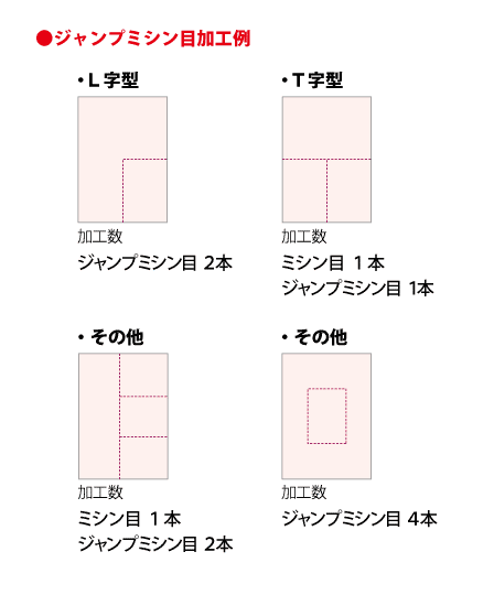 ジャンプミシン目と他ミシン目が接する箇所において、製造工程上ミシン目が2ミリ程度交差する可能性がございますのでご了承ください。